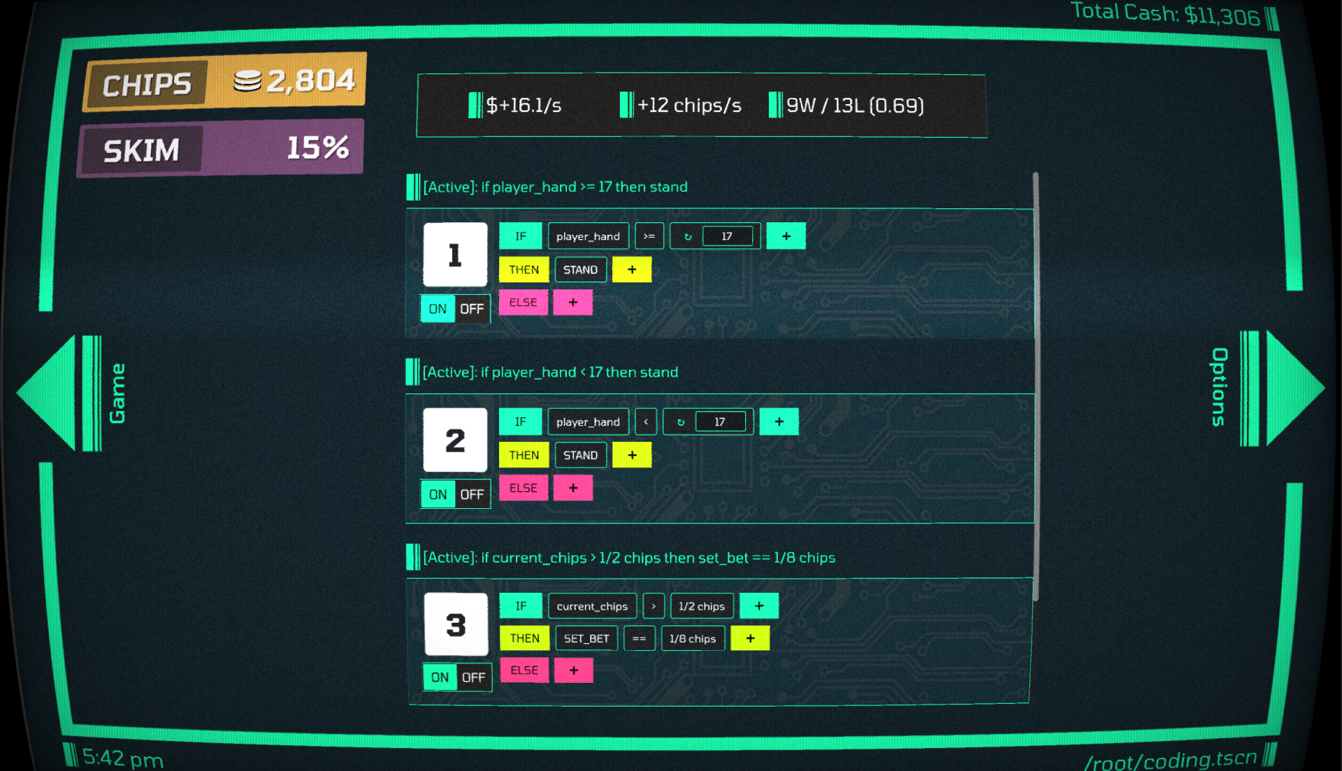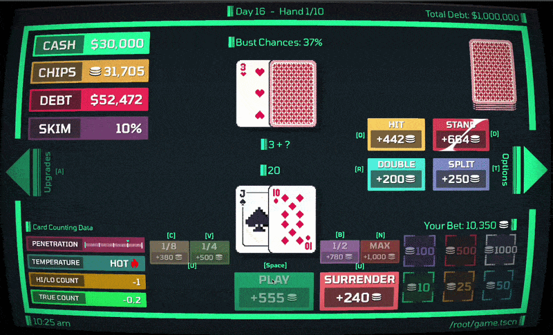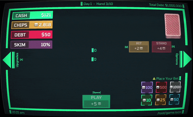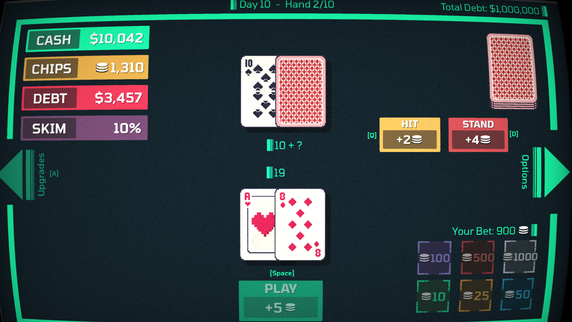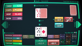 In IdleJack, you play as the captive of a The House, forced to gamble your way to freedom by playing Blackjack on a Terminal. Starting with 1,000 chips and a $1,000,000 debt, you must turn Blackjack into a profitable game using Basic Strategy, Card Counting, all the way to full automation.